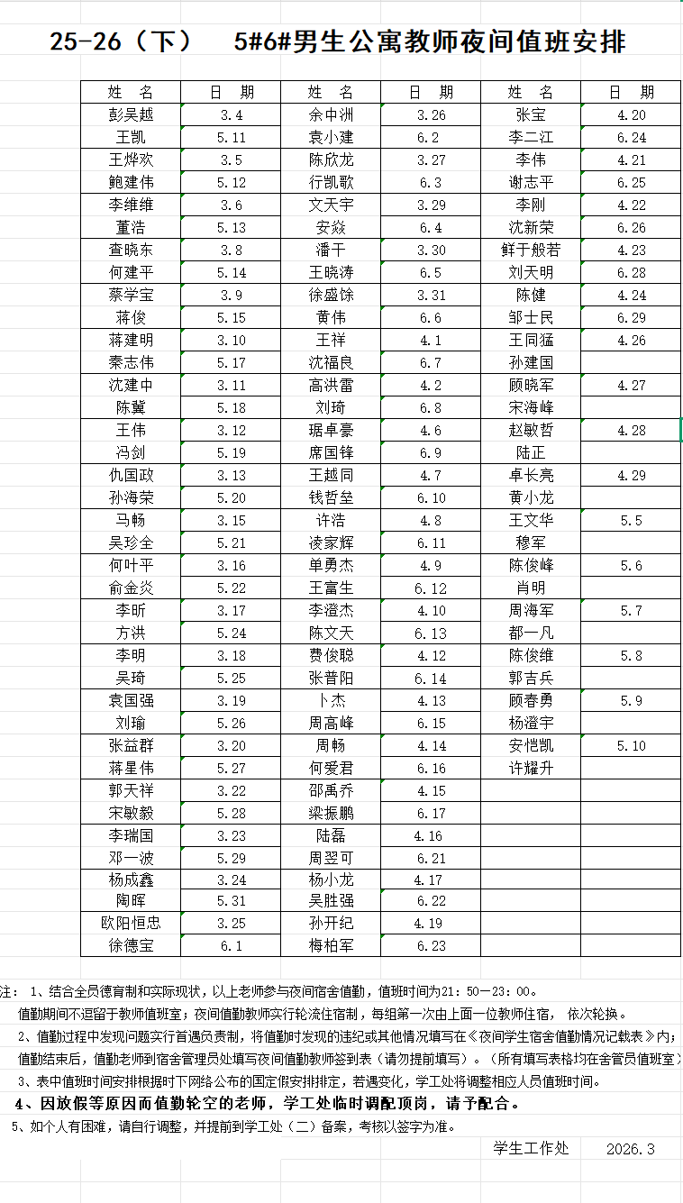 2025-2026学年第二学期学生公寓教师夜间值班安排