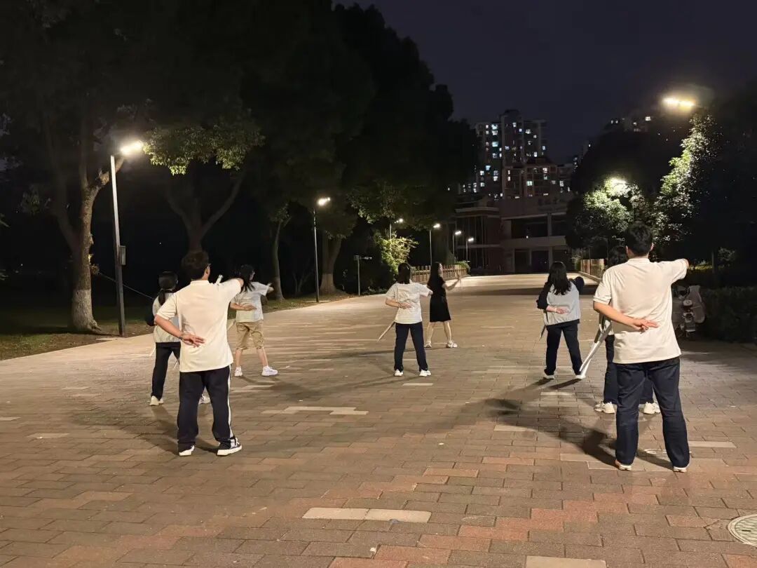 筹备运动会表演的日子,是剑队最难忘的时光。从最初的动作生疏、剑花不稳,到后来的发力精准、默契十足,背后是“零间断”的坚持:课后的暮色中,总能看到队员们握剑练习的身影,汗水浸湿练功服,却没人停下脚步。起初,连社长都悄悄担心“大家会不会中途放弃”,可队员们的坚持超出了预期:有人为纠正一个发力点,反复练习几十遍;有人记不住剑花顺序,利用一切碎片时间琢磨;新老队员互相帮带,把“难”变成了“再试一次”。最终,当所有人能整齐划一地完成整套剑法时,这份成长,成了他们青春里最珍贵的勋章。