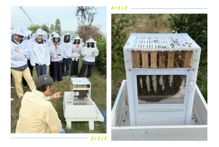 师生们率先聚焦农场核心创新成果 —— 永德箱,近距离观察这款无接触式蜂箱的运作:透明观察窗清晰呈现蜂群动态,特殊取蜜装置无需开箱即可完成提取,既减少对蜂群的惊扰,又让养蜂操作更便捷,直观感受科技赋能生态养蜂的魅力。