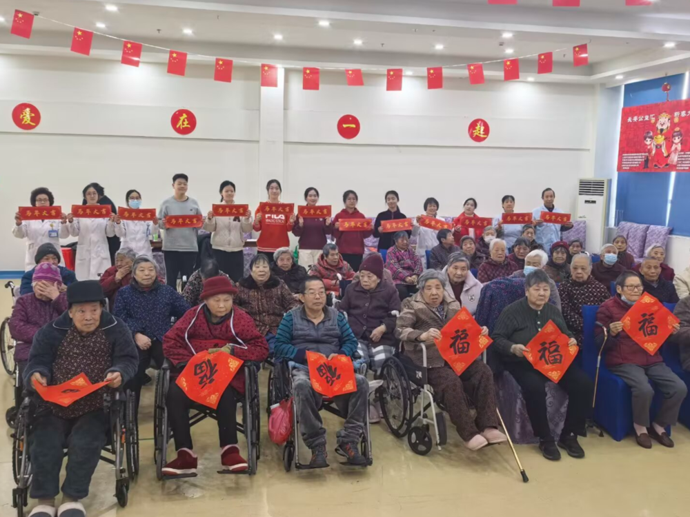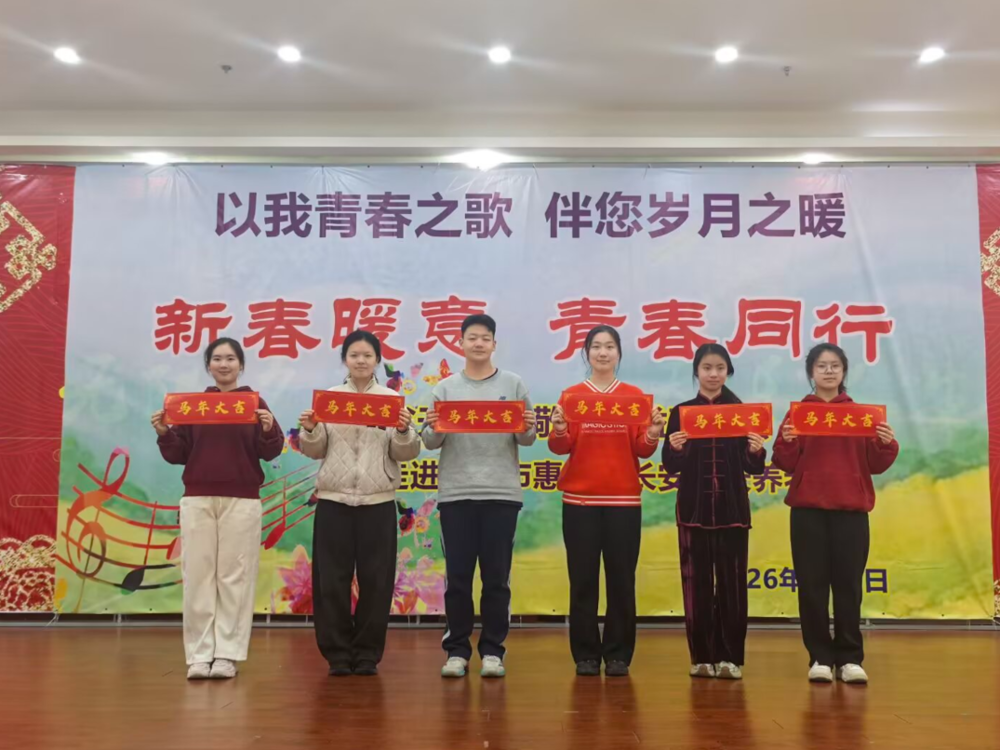 活动伊始,红衣学子主持人登场,清脆亲切的话语打破了庭院的静谧。没有繁琐的流程,唯有真诚的问候,一句句“爷爷奶奶新年好”,简单却暖心,快速拉近了与老人们的距离,清晰介绍活动流程,稳稳开启了这场充满爱意的新春盛宴,老人们的脸上瞬间绽开了笑容。红衣映暖阳,歌声送安康。学子们轮番献唱,经典老歌婉转悠扬,新春小调轻快悦耳,清澈的嗓音回荡在庭院中。动听的歌声,不仅传递着新春的喜悦,更承载着学子们对老人们最真挚的美好祝愿。歌声落幕,舞姿翩跹。学子们舒展身姿,用整齐灵动的舞蹈,展现青春风采,传递敬老敬意。舒缓的舞步温婉动人,轻快的舞姿活力满满,每一个动作都饱含心意,每一次微笑都温暖治愈。老人们的阵阵掌声不绝于耳,红衣少年与白发老人,构成了冬日里最温情的画面。活动现场,老人们全程专注观看节目,眼神温柔又明亮,脸上始终洋溢着慈祥的笑容,不时为学子们的精彩表现轻轻鼓掌、点头赞许,那份欢喜与欣慰,藏在每一个细微的神情里。节目落幕,身着红色服饰的同学们纷纷举起春联,与老人们合影,红衣映着白发,笑容温暖治愈,每一张照片,都定格下这场新春里最温情、最珍贵的瞬间。