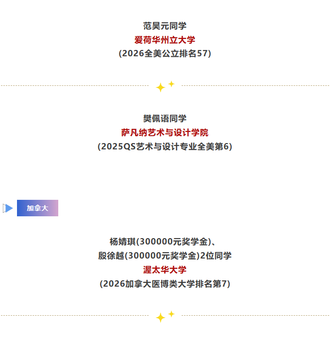除了美国名校,我校学子还收获了英国G5名校剑桥大学、帝国理工学院、伦敦政治经济学院、伦敦大学学院,中国香港大学、香港科技大学、香港中文大学和香港理工大学等,加拿大多伦多大学、麦吉尔大学、英属哥伦比亚大学、滑铁卢大学,以及澳大利亚悉尼大学等名校的录取。