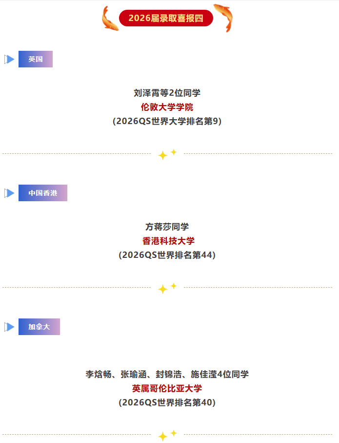 2026届录取季正式开启,截至12月11日,我校AP课程班一批同学喜获美国、英国、加拿大、中国香港、澳大利亚、新西兰多所世界顶尖名校录取!这一喜讯不仅是对他们辛勤付出的充分肯定,更为我们带来了无限的信心与期待!