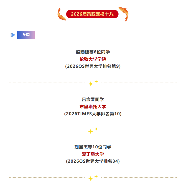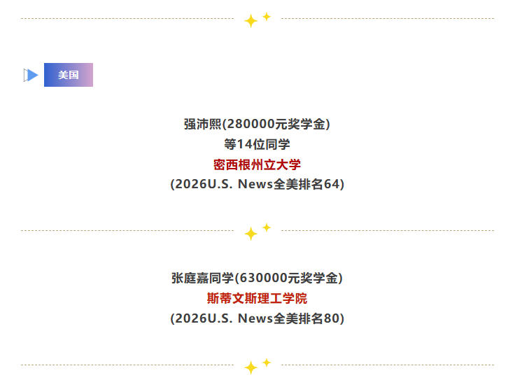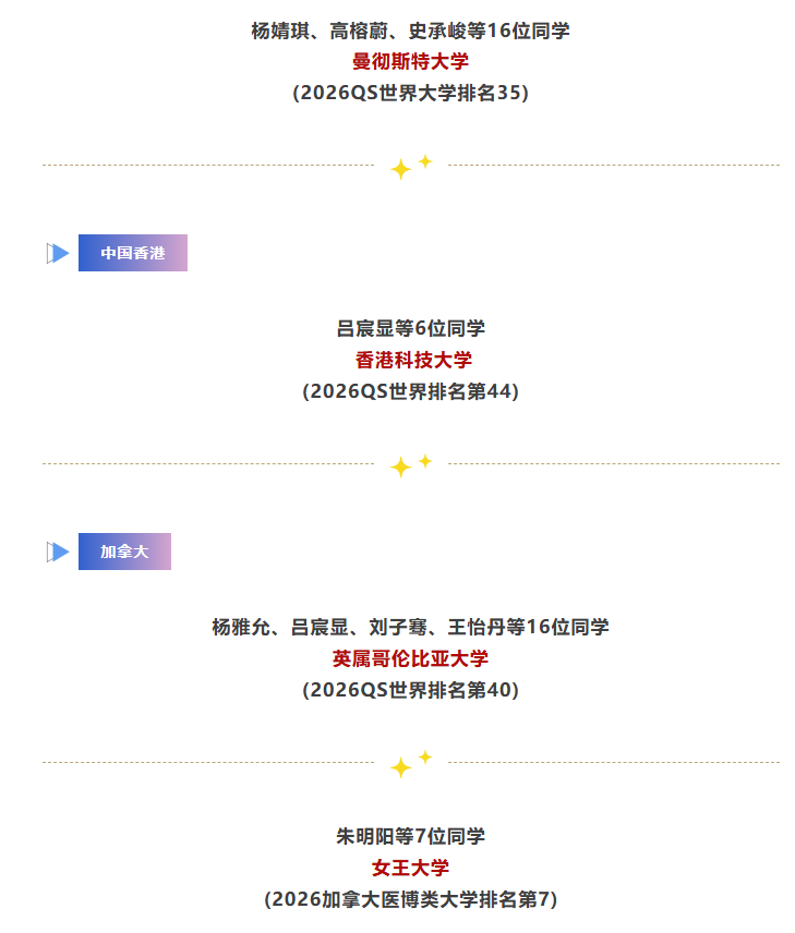 【录取喜报十八】港科大6人!英港加美名校又传喜讯! 发布时间:2026-02-06 点击数: 次 【字体:小 大】 继成功斩获美国常青藤名校康奈尔大学(3枚)、全美TOP20圣路易斯华盛顿大学、密歇根大学安娜堡分校、汉密尔顿学院;加拿大麦吉尔大学、多伦多大学;以及中国香港大学、香港科技大学(5枚)等顶尖名校录取后,近日天一国际部2026届高三学子再传捷报,一大批同学喜获美英港澳名校录取,累计奖学金总额近3800万元。 这一份份沉甸甸的喜报,既是对同学们长期努力与坚持的高度认可,也为我们注入了满满信心。让我们共同期待更多梦想成真的时刻! 分享到: 【打印正文】