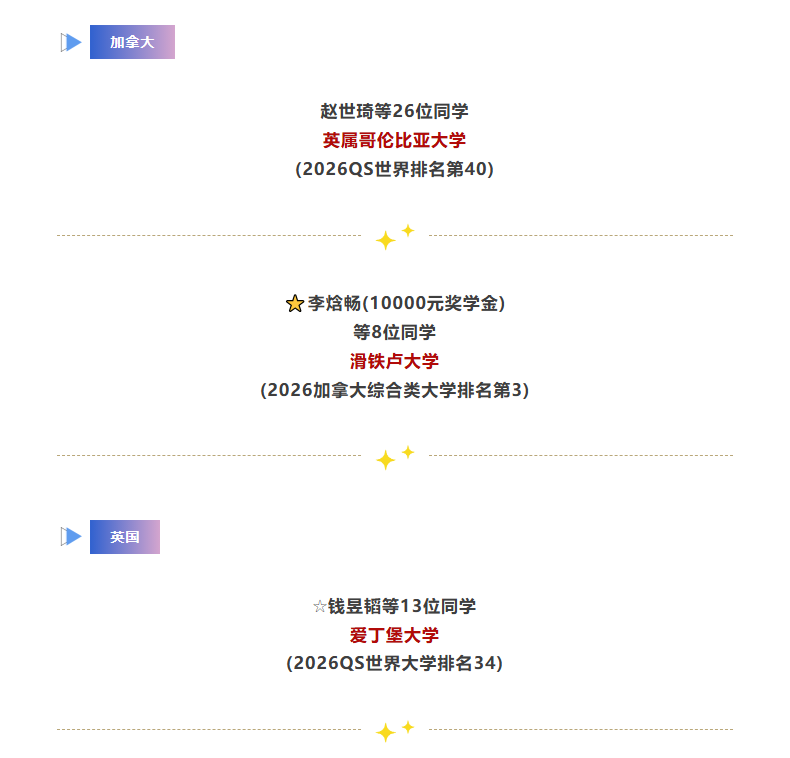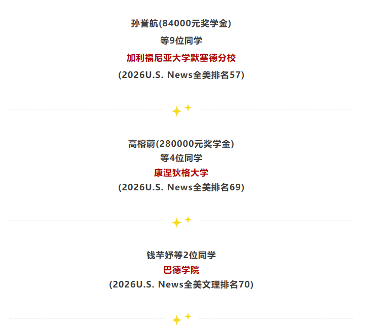 继成功斩获美国常青藤名校康奈尔大学(3枚)、全美TOP10卡尔顿学院、TOP20圣路易斯华盛顿大学、密歇根大学安娜堡分校(2枚)、汉密尔顿学院(2枚)、卡耐基梅隆大学,TOP30北卡罗来纳大学教堂山分校、南加利福尼亚大学(2枚)、加州大学圣地亚哥分校、德克萨斯大学奥斯汀分校、里士满大学、科尔比学院(2枚)、玛卡莱斯特学院;加拿大麦吉尔大学(12枚)、多伦多大学(48枚)、英属哥伦比亚大学(26枚)、英国伦敦大学学院(15枚)、曼彻斯特大学(21枚);以及中国香港大学(4枚)、香港中文大学、香港科技大学(6枚)等顶尖名校录取后,近日天一国际部2026届高三学子再传捷报,一大批同学喜获美加英港名校录取,累计奖学金总额近4800万元。