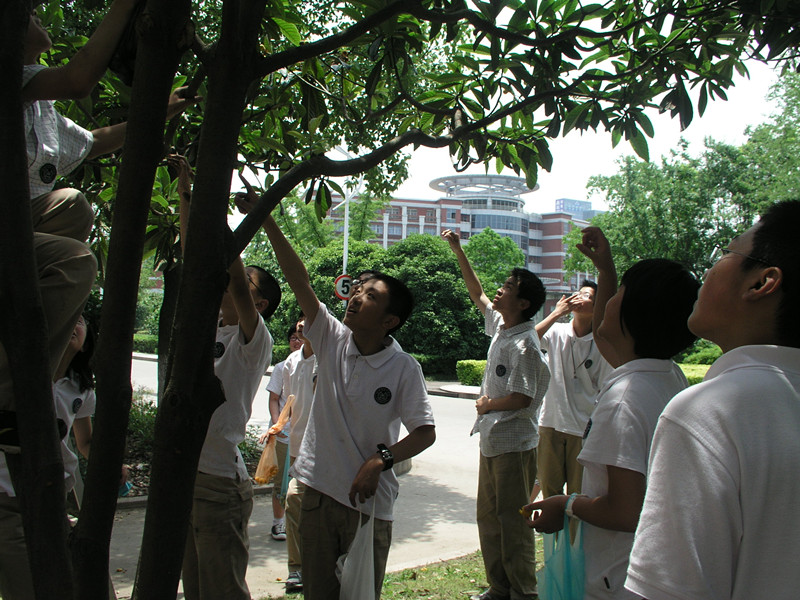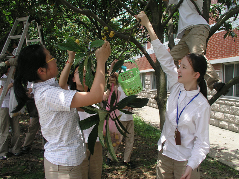 5月29日中午,我们少一(3)班全体学生来到专家楼边的枇杷林摘枇杷。一颗颗小而结实的枇杷像掩映在林中的一张张笑脸,洋溢着阵阵香气,伴随着翠叶褐枝,好一派生机盎然之景。在尝了几个酸甜可口的枇杷之后,我们便摩拳擦掌跃跃欲试了。这个攀住树干,一蹬树腰,“嗖”地便跃上了枝头,闲适地坐在树丫上,得意地摘起了枇杷。几个男生踮起脚尖去撩被果实压弯的枝头;几个女生颗粒无收有些着急,便在工人叔叔的帮助之下,一边接枇杷,一边说谢谢。不知什么时候,沈校长也笑容满面地看着我们机灵地来回小跑。而我们也冷不丁地把几个大枇杷塞到了沈校长的手中,直嚷着让校长尝尝,大家笑声盈盈,笑语不断。