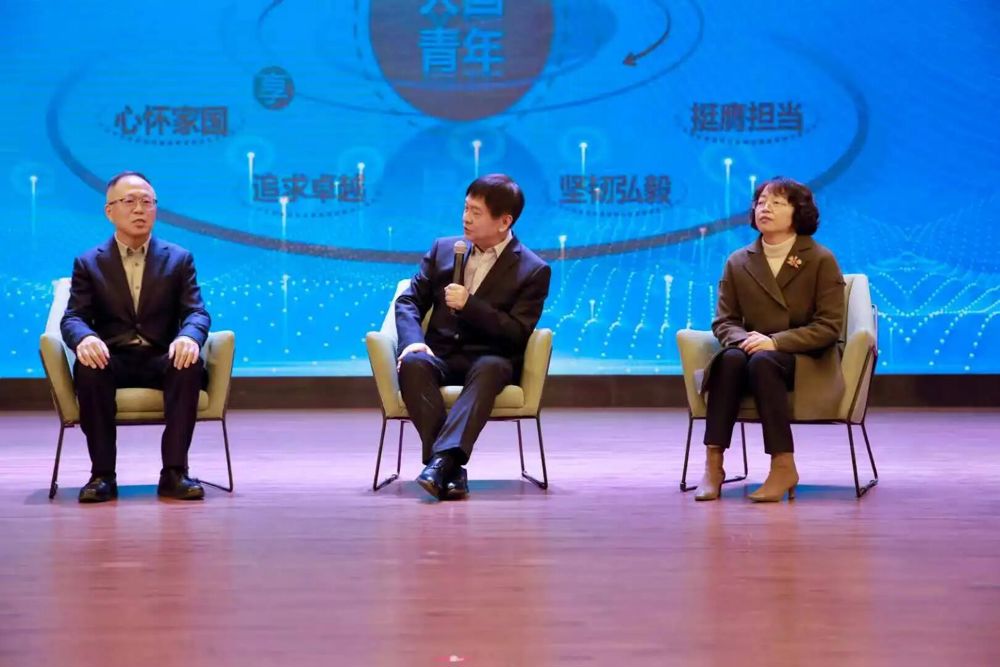 讲座的余音仍在剧场回荡,思想的碰撞已悄然开启。在主持人邀请下,姚峰老师与天一中学党委副书记冯冬雁、执行校长陆锋磊、学工处主任刘天明一同走上舞台,围绕“美育与青年成长”展开了一场面对面的深度对话。