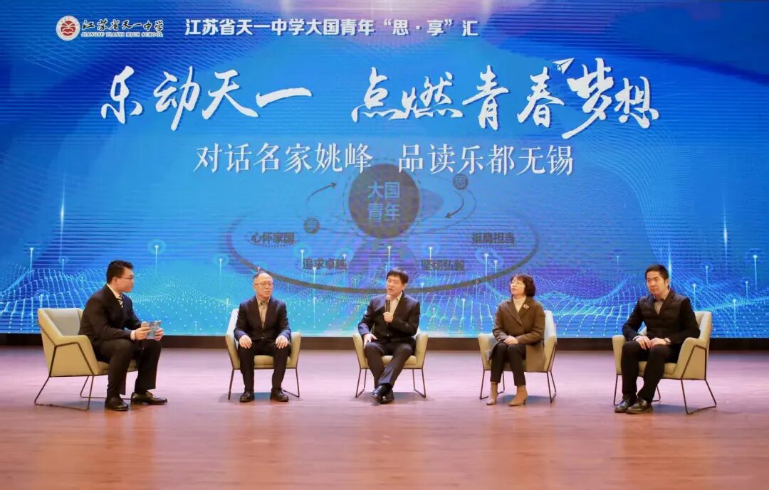讲座的余音仍在剧场回荡,思想的碰撞已悄然开启。在主持人邀请下,姚峰老师与天一中学党委副书记冯冬雁、执行校长陆锋磊、学工处主任刘天明一同走上舞台,围绕“美育与青年成长”展开了一场面对面的深度对话。