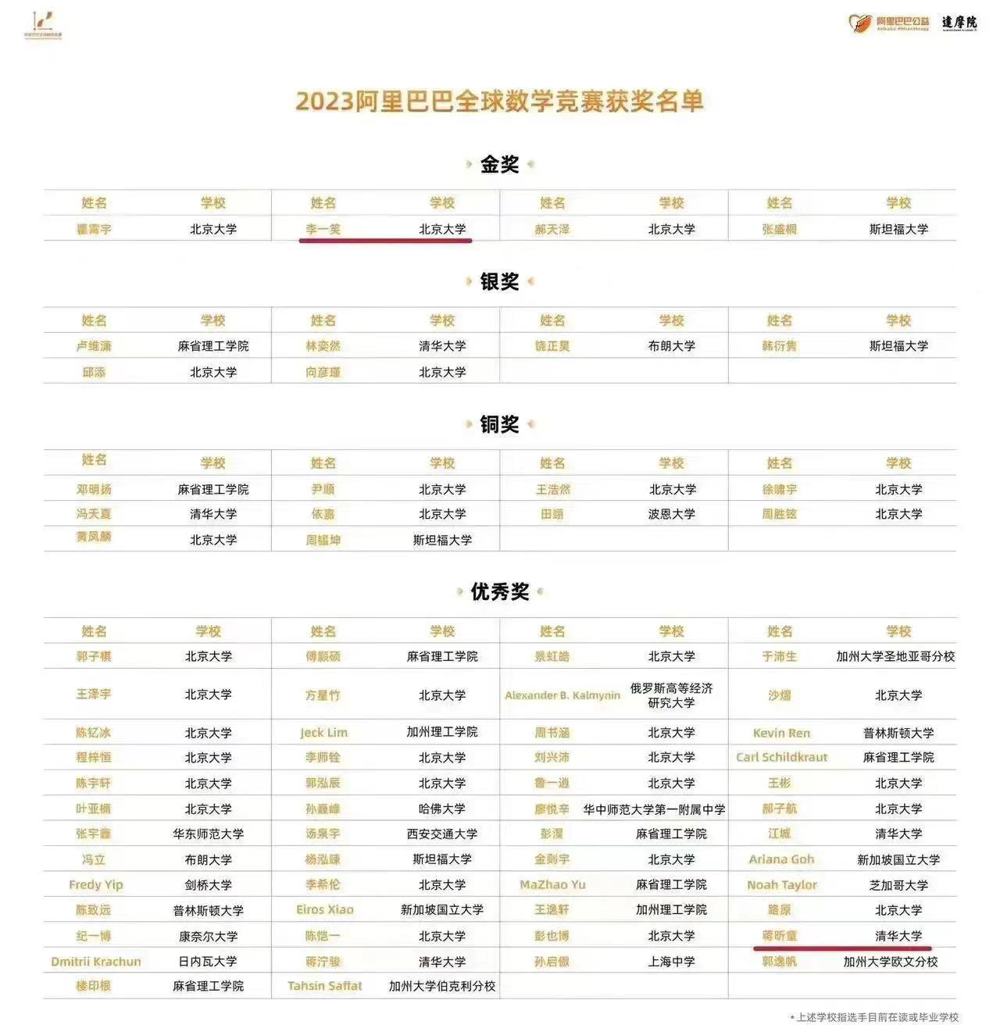 9月16日傍晚,2023阿里巴巴全球数学竞赛落下帷幕,天一中学校友李一笑荣获满分金奖,蒋昕童获得优秀奖。