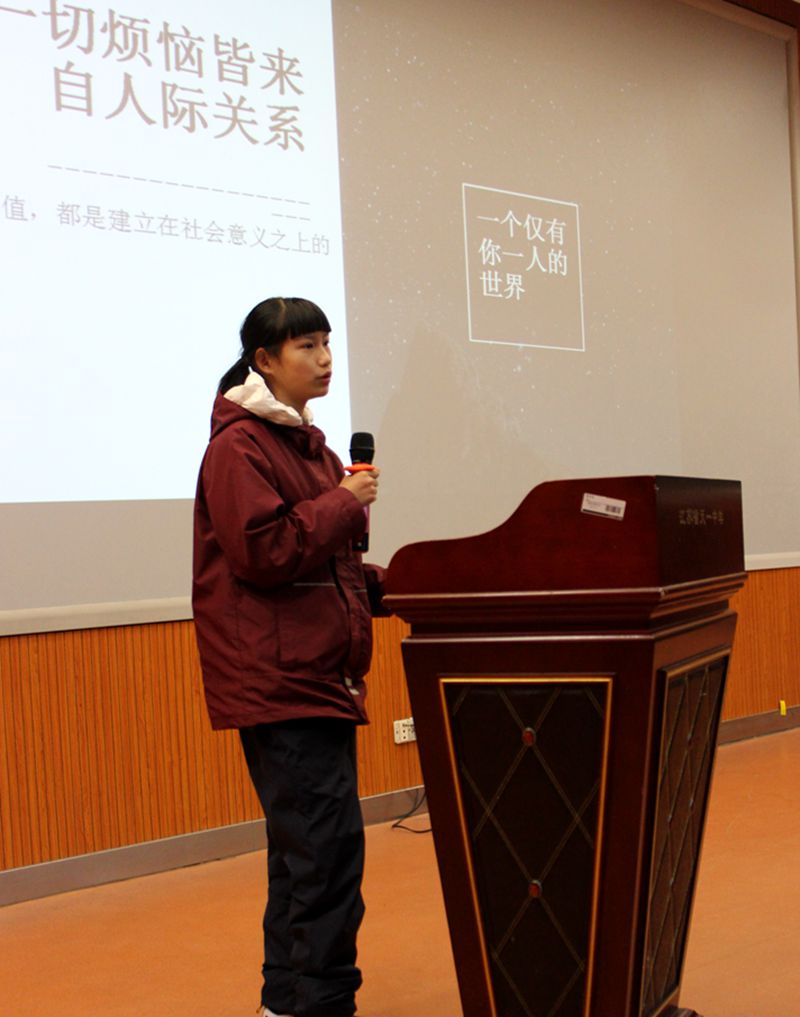 王艺睿同学给我们带来了“看一眼世界”的精彩演讲。从最从最简单的图画讲起,给我们讲述了乔哈里视窗。“丧钟为谁而鸣”,它表达了人类是息息相关的,每个人都是世界的一员。一切烦恼都来自人际关系,并且用100元钱叠成叠来举例,在一个仅有你一个人的世界里并没有任何用处。如何评价是建立在社会意义之上的自卑感?纯粹主观臆断。成为自己是一个社会问题。她引用一个人生哲理游戏。揭示了一个人的心理关乎他人,关乎世界。